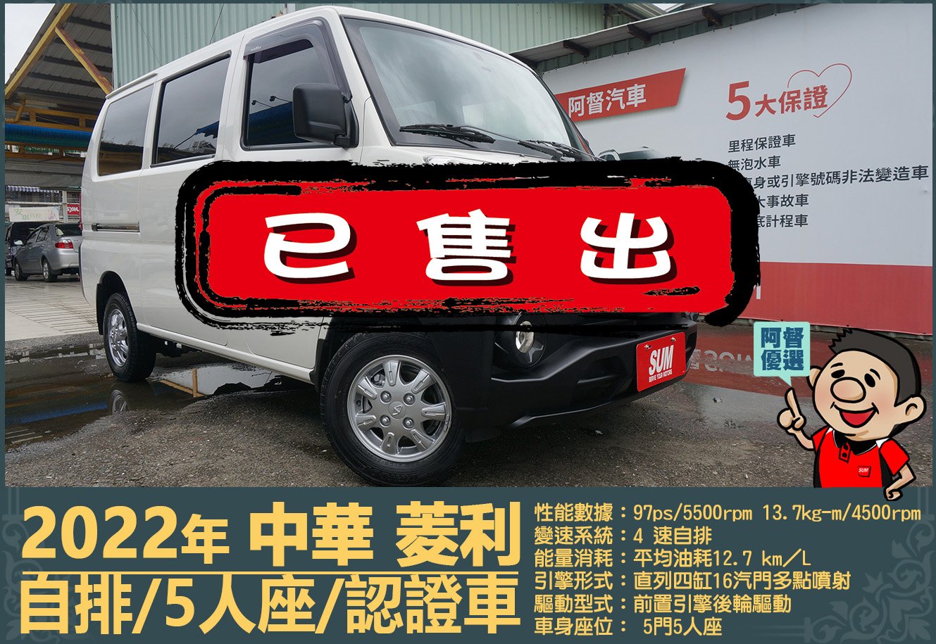 2022年 中華菱利│5人座│自排│雙安全氣囊│一年僅跑不到一萬七千公里│兒童安全座椅座│全車系第三方認證│全宇宙唯一不沒收訂金│交車全車保固一個月│阿督嚴選貨車首選